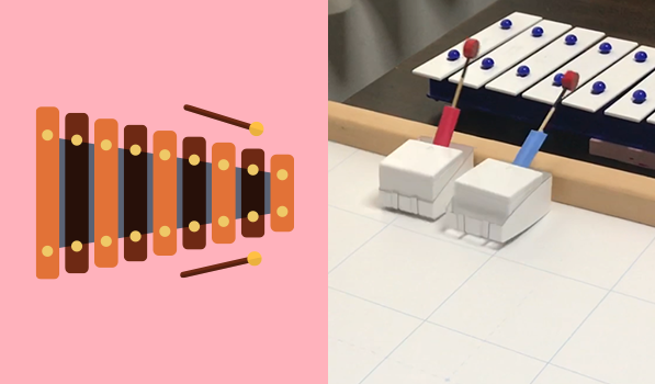 作品のサイトから型紙(かたがみ)をダウンロードし、A4のあつめの紙に印刷(いんさつ)して紙工作で鉄琴をたたく仕組みを作りましょう。鉄琴をたたくために竹ぐしなどでバチをとりつけましょう。