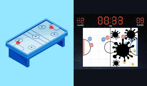 さあエアホッケーで対戦しましょう!キューブを左右に動かしながら角度をかえるとうちかえす角度もかわります。アイテムを取ると何がおこるかな?色によってちがうかも?