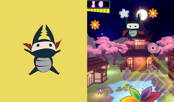 キューブをマットの上で少しひねってかたむけると、クワガタムシ忍者がのっているカラフルな花ががたむいてジャンプする向きをかえられます。花の上にもどれるようにうまくキューブを動かします。