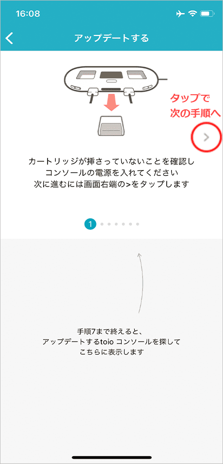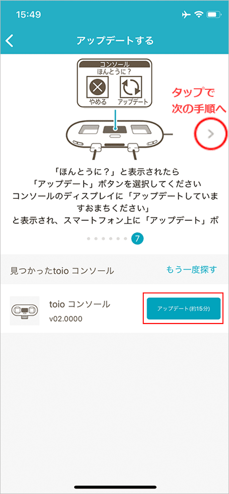 toioアップデートアプリの「見つかったtoioコンソール」の「アップデート」ボタンを押して下さい。