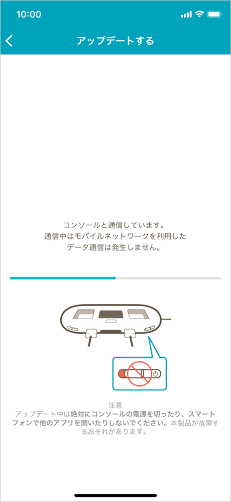 アップデート中は絶対にコンソールの電源を切ったり、スマートフォンで他のアプリを開いたりしないでください。本製品が故障するおそれがあります。