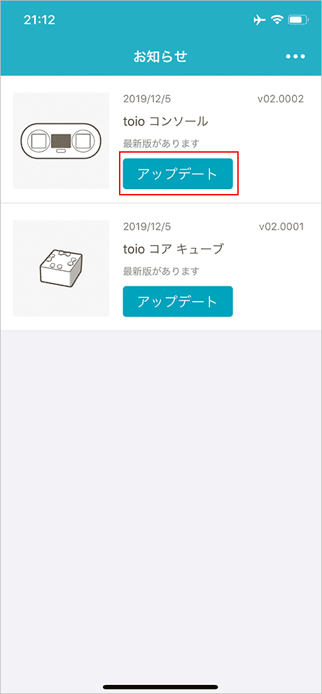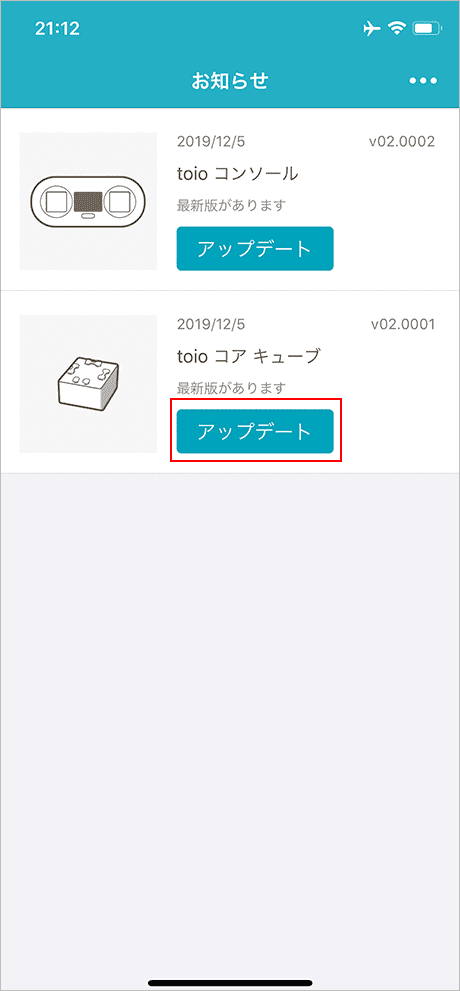 「お知らせ」のtoioコア キューブの「アップデート」ボタンをタップします。