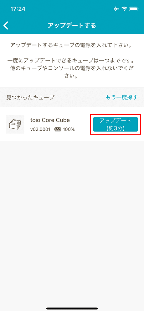 キューブが見つかるとアップデートアプリが左の画面になります。「アップデート」ボタンを押してください。
