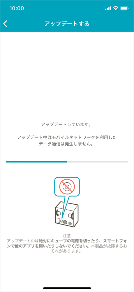 アップデート中は絶対にキューブの電源を切ったり、スマートフォンで他のアプリを開いたりしないでください。本製品が故障するおそれがあります。