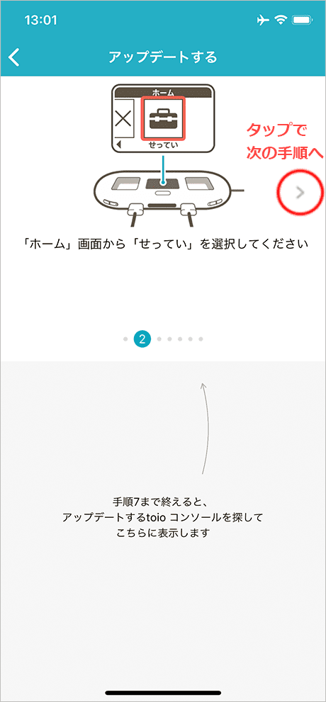 「お知らせ」のtoioコンソールの「アップデート」をタップします。