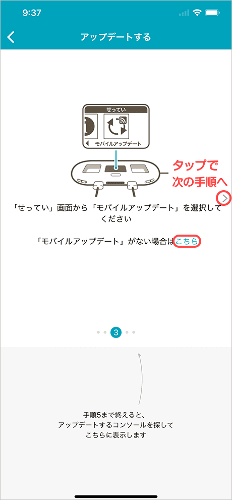 「モバイルアップデート」がない場合は「こちら」をタップすると「モバイルアップデート」を表示させるための手順に進みます。その場合はこちら(「モバイルアップデート」アイコンが表示されない場合)の手順に進んでください。